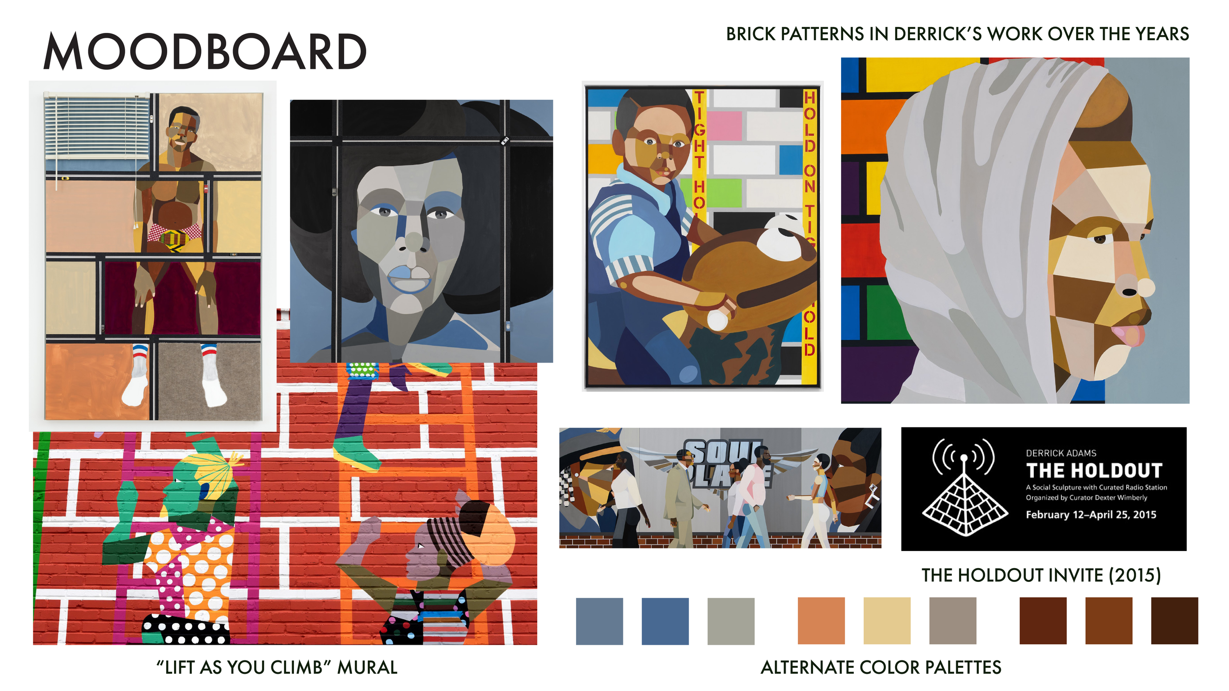 Concepts: The wall prints will be a graphic interpretation of a home, symbolizing community and social gathering in a familial setting. Each wall will have different brick color palettes drawn from Derrick’s previous work.